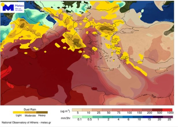 «Η ατμοσφαιρική κυκλοφορία που επικρατεί επάνω από την Ευρωπαϊκή ήπειρο και τη Βόρεια Αφρική έχει ως συνέπεια τους ανέμους νότιας συνιστώσας σε μεγάλο τμήμα της Κεντρικής και Ανατολικής Μεσογείου, περιλαμβανομένης και της χώρας μας. Η κατάσταση στη χώρα μας, σε ότι αφορά τους ανέμους στην μέση και κατώτερη τροπόσφαιρα, δεν αναμένεται να αλλάξει σημαντικά έως την Πέμπτη 08/01. Αποτέλεσμα είναι οι αυξημένες συγκεντρώσεις Αφρικάνικής σκόνης στην ατμόσφαιρα και κατά συνέπεια η εκδήλωση λασποβροχών κατά τόπους.