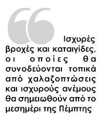 1. Ισχυρές βροχές και καταιγίδες, που θα συνοδεύονται τοπικά από χαλαζοπτώσεις και ισχυρούς ανέμους, θα σημειωθούν από το μεσημέρι της Πέμπτης στο Ιόνιο, στη δυτική και στη βόρεια Ελλάδα και βαθμιαία στα υπόλοιπα ηπειρωτικά και πιθανόν στις Κυκλάδες, στην Κρήτη, στα νησιά του ανατολικού Αιγαίου και στα Δωδεκάνησα.