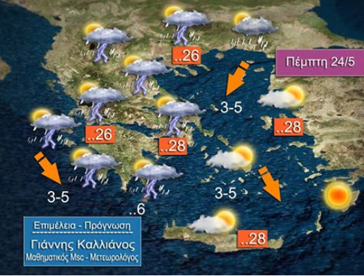 Την Πέμπτη, στην Αθήνα, η μέρα θα ξεκινήσει με σχετικά καλό καιρό. Από το μεσημέρι όμως οι νεφώσεις θα πυκνώσουν και θα εκδηλωθούν βροχές και τοπικές καταιγίδες. Στη Θεσσαλονίκη οι βροχές θα έχουν ξεκινήσει νωρίτερα, από τις πρωινές ώρες.