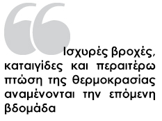 Αλλάζει από την Δεύτερα και την Τρίτη το σκηνικό του καιρού με ισχυρές βροχές και καταιγίδες στα βόρεια και τα ηπειρωτικά, το Ιόνιο και το βόρειο Αιγαίο αλλά και περαιτέρω πτώση της θερμοκρασίας, ενώ σήμερα αναμένονται παροδικά αυξημένες νεφώσεις, με σποραδικές βροχές ή καταιγίδες στη δυτική και βορειοδυτική χώρα, και εντονότερα φαινόμενα στα ορεινά.