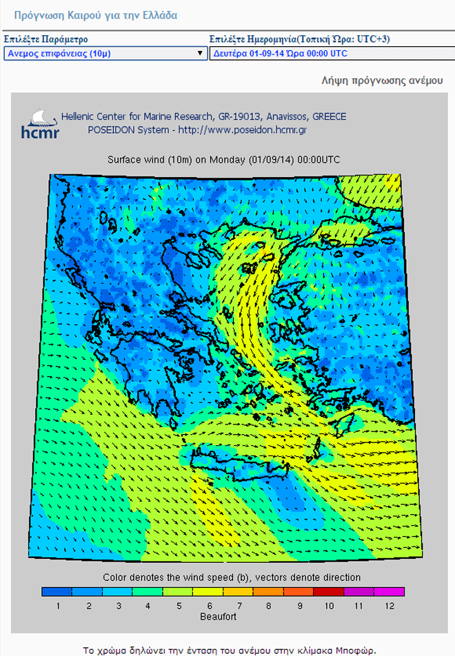 Οι άνεμοι στο Αιγαίο θα πνέουν από βόρειες διευθύνσεις ισχυροί έως σχεδόν θυελλώδεις, 6 με 7 μποφόρ, και τοπικά θυελλώδεις 8 μποφόρ. Στο Ιόνιο οι άνεμοι θα πνέουν δυτικοί βορειοδυτικοί σχεδόν μέτριοι 4 μποφόρ και τοπικά μέτριοι 5 μποφόρ.