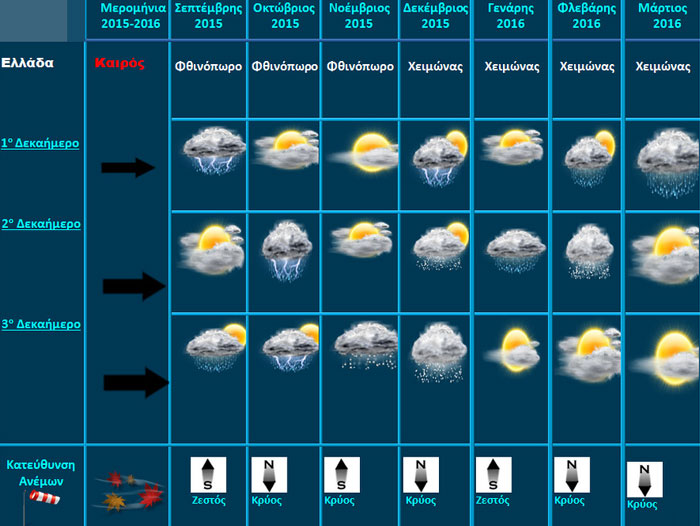 Όπως φαίνεται και από τον παραπάνω πίνακα ο Σεπτέμβριος όπως και ο Οκτώβριος θα είναι βροχεροί, ενώ ο χειμώνας θα είναι ιδιαίτερα βαρύς αλλά και ξηρός, αφού προβλέπονται χιόνια και μάλιστα από το Νοέμβριο.