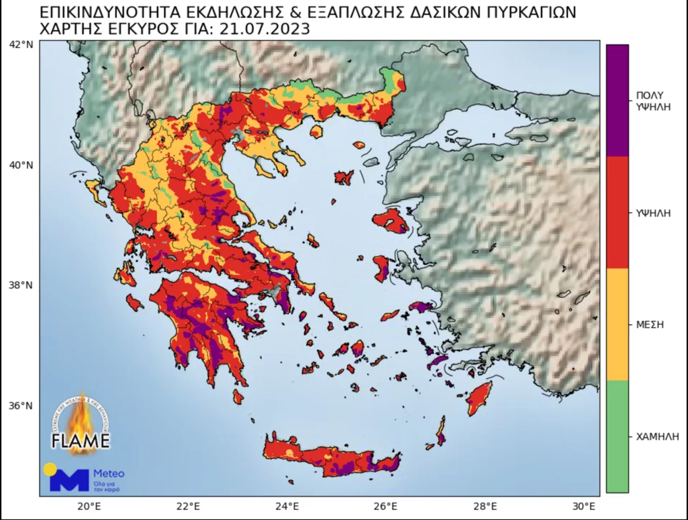 Παράλληλα, με βάση τα προγνωστικά στοιχεία της πυρομετεωρολογικής ομάδας FLAME του Εθνικού Αστεροσκοπείου Αθηνών (ΕΑΑ) / meteo.gr, δυσμενείς πυρομετεωρολογικές συνθήκες αναμένεται να επικρατήσουν σε αρκετές περιοχές της χώρας, και ιδιαίτερα σε τμήματα της ανατολικής και νότιας ηπειρωτικής χώρας και στο Αιγαίο.