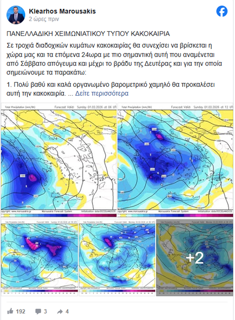 «Ένα βαθύ βαρομετρικό χαμηλό θα μας επηρεάσει από το απόγευμα του Σαββάτου και κυρίως την Κυριακή μέχρι το μεσημέρι της Δευτέρας, με ισχυρές βροχές και καταιγίδες. Το σύστημα παρουσιάζει σαφή σπειροειδή δομή, ισχυρή σύγκλιση χαμηλών στρωμάτων, μεγάλα πεδία συνεχούς υετού, και ενεργή αλληλεπίδραση με ανώτερη διαταραχή. Η επισήμανση ότι τα φαινόμενα ενδέχεται να είναι ισχυρά αναφέρεται ήδη στην γενική πρόγνωση της ΕΜΥ .