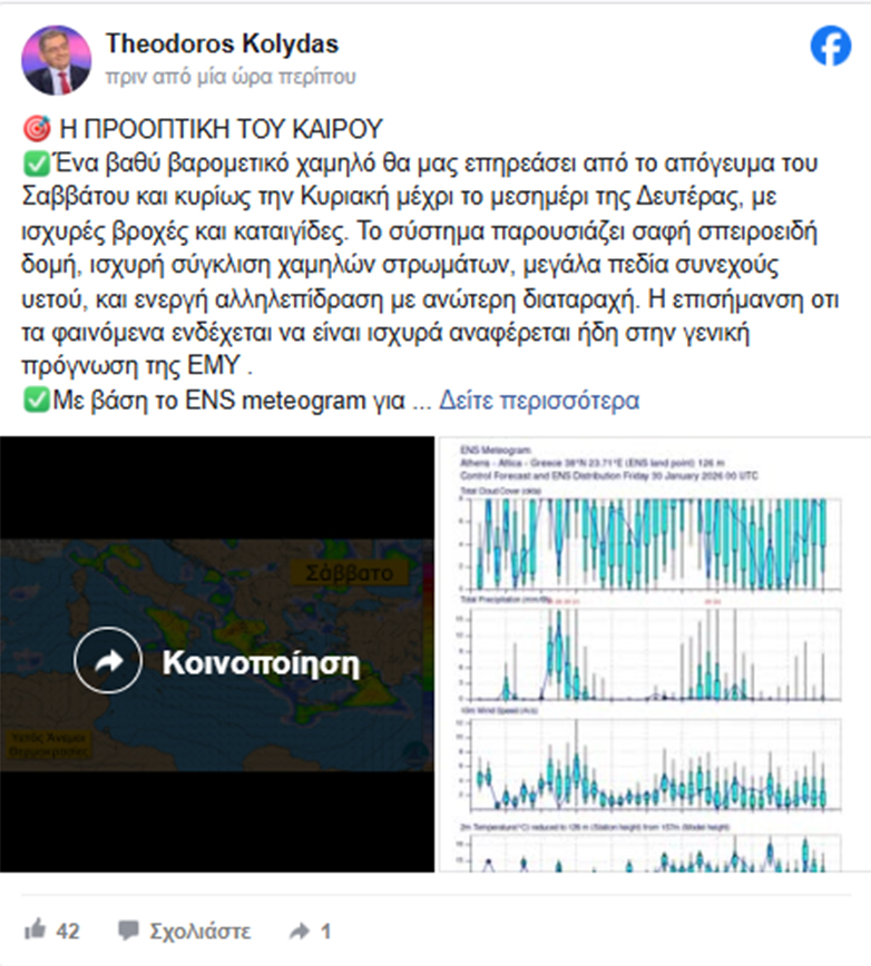 Ο Θεόδωρος Κολυδάς στην ανάρτησή του αναφέρει ότι θα πέσουν μεγάλες ποσότητες νερού αγγίζοντας τα 60–65 mm/24ωρο κατά τόπους.