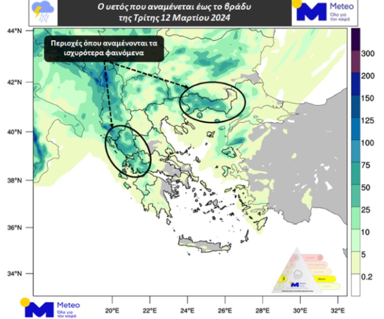 Ο αθροιστικός υετός που αναμένεται έως το βράδυ της Τρίτης 12/03 καθώς και οι περιοχές όπου αναμένονται τα ισχυρότερα φαινόμενα