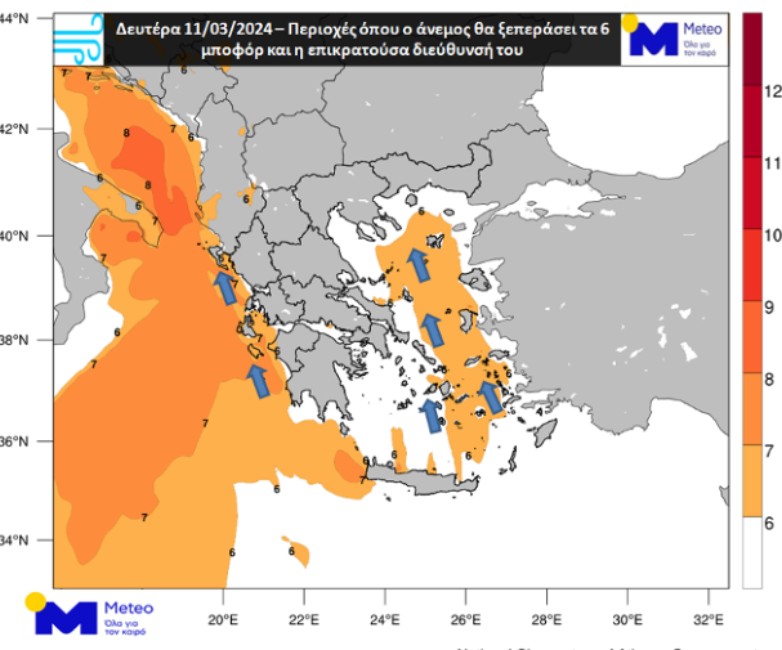 Οι περιοχές όπου ο άνεμος θα ξεπεράσει τα 6 μποφόρ τη Δευτέρα 11/03 και η επικρατούσα διεύθυνσή του