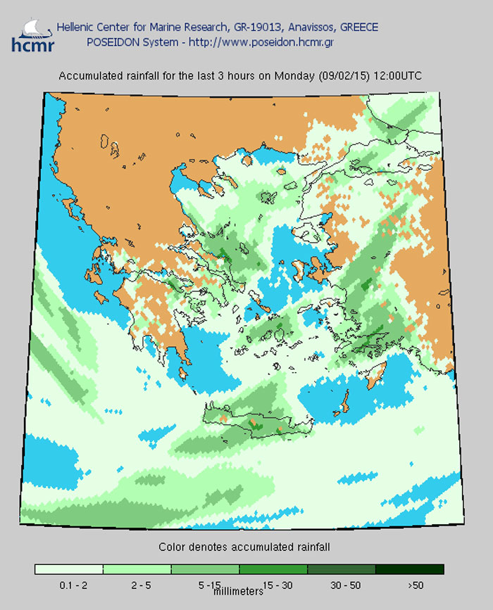 Το χρώμα δηλώνει το αθροιστικό ύψος της βροχόπτωσης το τελευταίο 3ωρο