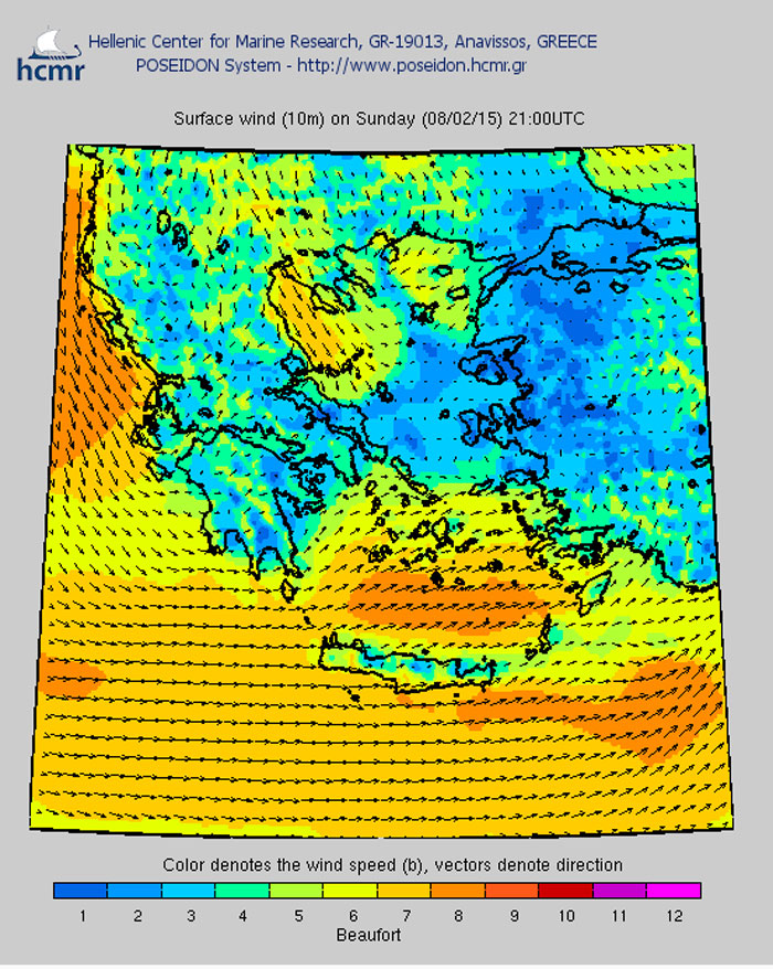 Το χρώμα δηλώνει την ένταση του ανέμου στην κλίμακα μποφόρ
