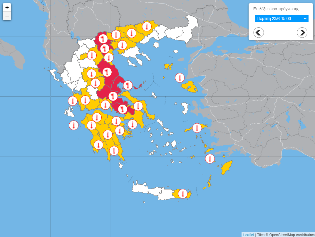 Στο ίδιο μήκος κύματος κινείται και η πρόγνωση του καιρού από το meteo.gr του Εθνικού Αστεροσκοπείου Αθηνών, το οποίο έδωσε στη δημοσιότητα και τον χάρτη των θερμοκρασιών για τις 3 το μεσημέρι. Τα κόκκινα σημεία στον χάρτη αφορούν τις πολύ υψηλές θερμοκρασίες, ενώ τα πορτοκαλί, που καλύπτουν το μεγαλύτερο μέρος του χάρτη, τις υψηλές θερμοκρασίες.
