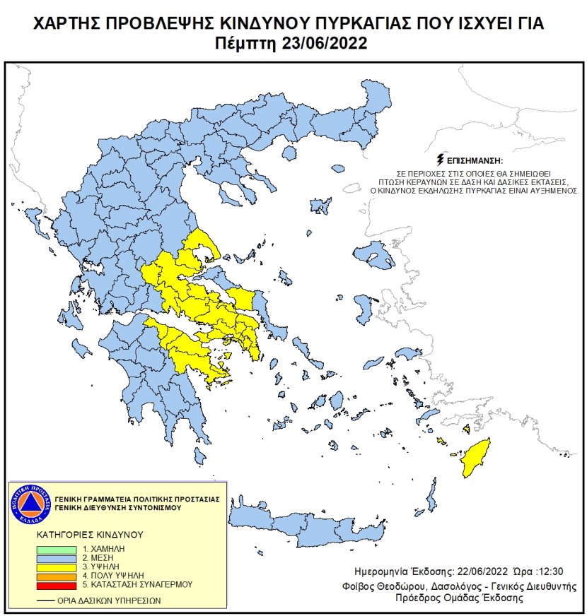 Σύμφωνα με τον χάρτη πρόβλεψης κινδύνου πυρκαγιάς που εκδίδει σε καθημερινή βάση η Γενική Γραμματεία Πολιτικής Προστασίας, προβλέπεται υψηλός κίνδυνος πυρκαγιάς επιπέδου 3, σε Αττική, Κεντρική Εύβοια, Κορινθία, Αργολίδα, Βοιωτία, Φθιώτιδα, Μαγνησία, σε περιοχές της Αχαΐας και της Φωκίδας και στα νησιά της ΠΕ Ρόδου.