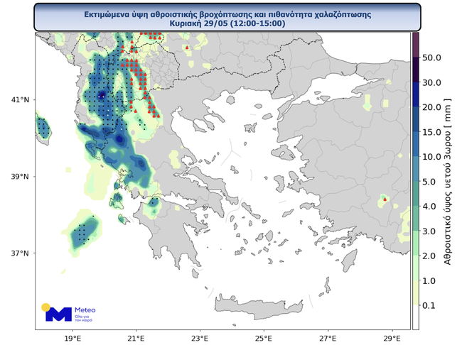 Αθροιστικός υετός 3ώρου για το χρονικό διάστημα μεταξύ 12:00-15:00 για την Κυριακή 29/5/2022. Με μαύρες κουκκίδες σημειώνονται οι περιοχές όπου είναι πιθανό να εκδηλωθεί μικρό χαλάζι (<2 cm) και με κόκκινα τρίγωνα σημειώνονται οι περιοχές όπου είναι πιθανό να σημειωθεί μεγάλο χαλάζι (> 2 cm) με βάση τον Δείκτη Μεγέθους Χαλαζιού που υπολογίζει επιχειρησιακά το Εθνικό Αστεροσκοπείο Αθηνών/meteo.gr.