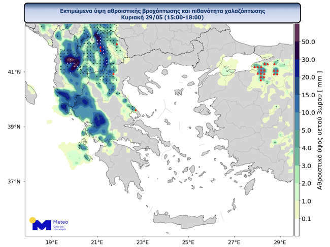 Αθροιστικός υετός 3ώρου για το χρονικό διάστημα μεταξύ 15:00-18:00 για την Κυριακή 29/5/2022. Με μαύρες κουκκίδες σημειώνονται οι περιοχές όπου είναι πιθανό να εκδηλωθεί μικρό χαλάζι (<2 cm) και με κόκκινα τρίγωνα σημειώνονται οι περιοχές όπου είναι πιθανό να σημειωθεί μεγάλο χαλάζι (> 2 cm) με βάση τον Δείκτη Μεγέθους Χαλαζιού που υπολογίζει επιχειρησιακά το Εθνικό Αστεροσκοπείο Αθηνών/meteo.gr.