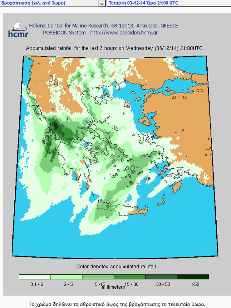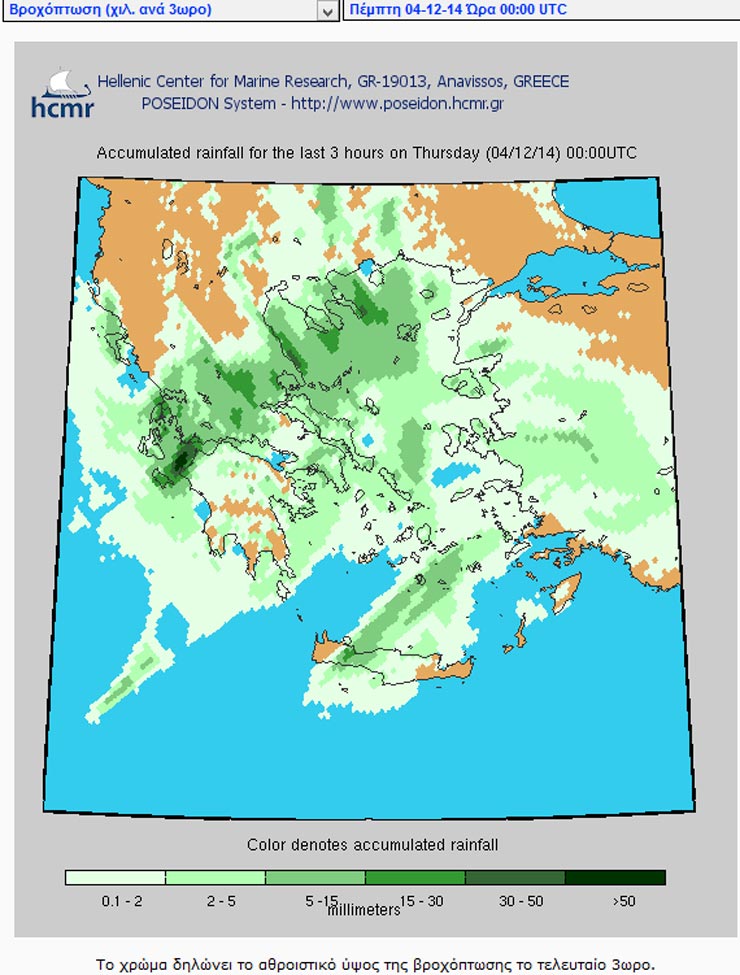 2. Από τις βραδινές ώρες σήμερα Τετάρτη (03-12-2014) και μέχρι τις πρώτες πρωινές ώρες της Πέμπτης (04-12-2014) ισχυρές βροχές και καταιγίδες θα εκδηλωθούν στο νότιο Ιόνιο, την Πελοπόννησο, τη Στερεά Ελλάδα (συμπεριλαμβανομένης της Αττικής), την Εύβοια, τη Θεσσαλία, τις Σποράδες και πιθανώς πρόσκαιρα την Κεντρική Μακεδονία (κυρίως Χαλκιδική), τις Κυκλάδες και την Κρήτη.