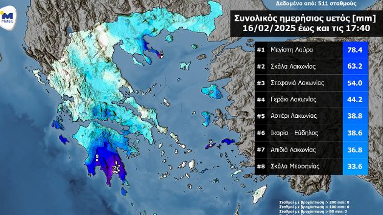 Σημαντικά ύψη βροχόπτωσης καταγράφηκαν έως τις απογευματινές ώρες της Κυριακής 16/02 στο Άγιο Όρος και σε τμήματα της Νότιας Πελοποννήσου, όπως διακρίνεται και στον παρακάτω χάρτη. Το μεγαλύτερο ύψος βροχής έως τις 17:40 έχει σημειωθεί στο μετεωρολογικό σταθμό στη Μεγίστη Λαύρα με 78.4 χιλιοστά.