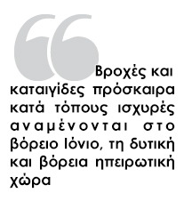 Άστατο καιρό με βροχές και καταιγίδες, αρχικά στη Βόρεια Ελλάδα και στο Ιόνιο, και σταδιακά στην υπόλοιπη ηπειρωτική χώρα, στο Βόρειο Αιγαίο και πιθανόν στα δυτικά τμήματα της Κρήτης, προβλέπονται για σήμερα. Τα φαινόμενα ενδέχεται τοπικά να είναι ισχυρά.