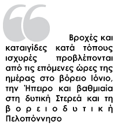 Ειδικότερα, βροχές και καταιγίδες, κατά τόπους ισχυρές, προβλέπονται από τις επόμενες ώρες της ημέρας στο βόρειο Ιόνιο, την Ήπειρο και βαθμιαία στη δυτική Στερεά και τη βορειοδυτική Πελοπόννησο.