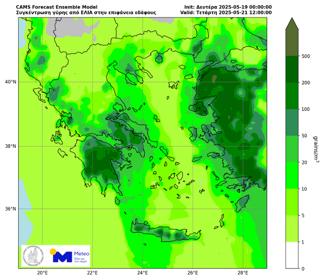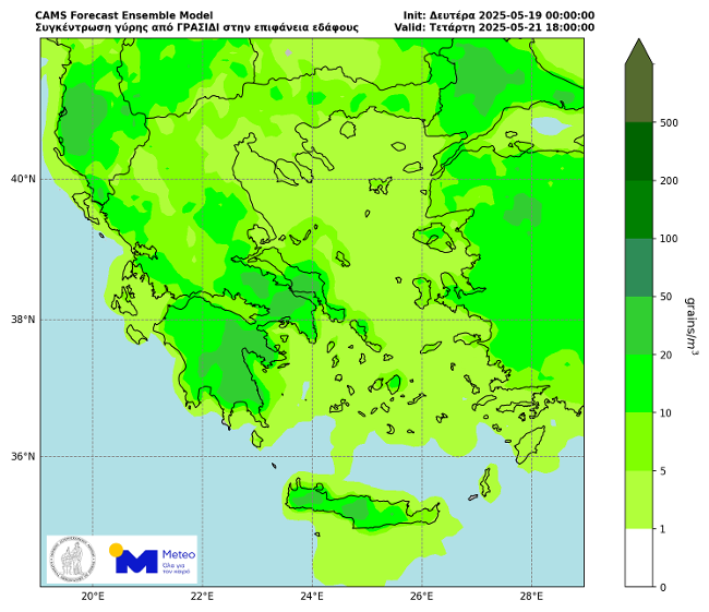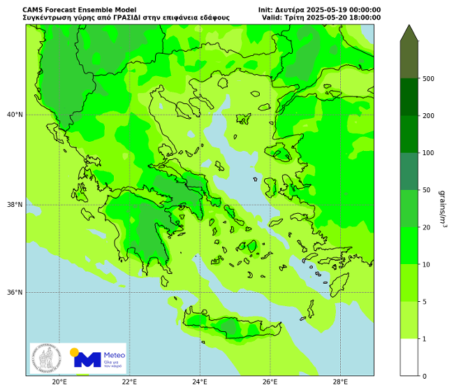 Σύμφωνα με τη Μετεωρολογική Υπηρεσία του Εθνικού Αστεροσκοπείου Αθηνών / meteo.gr, τις αυξημένες συγκεντρώσεις γύρης στην ατμόσφαιρα επιβεβαιώνουν και τα τελευταία προγνωστικά δεδομένα της Ευρωπαϊκής Υπηρεσίας Παρακολούθησης της Ατμόσφαιρας Copernicus/CAMS.