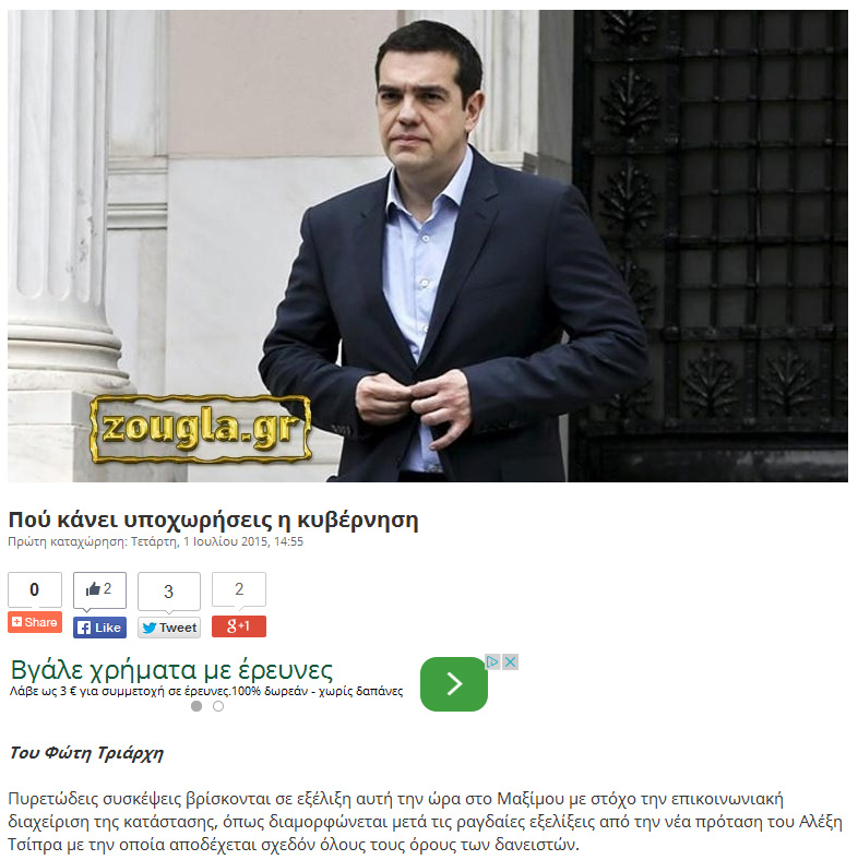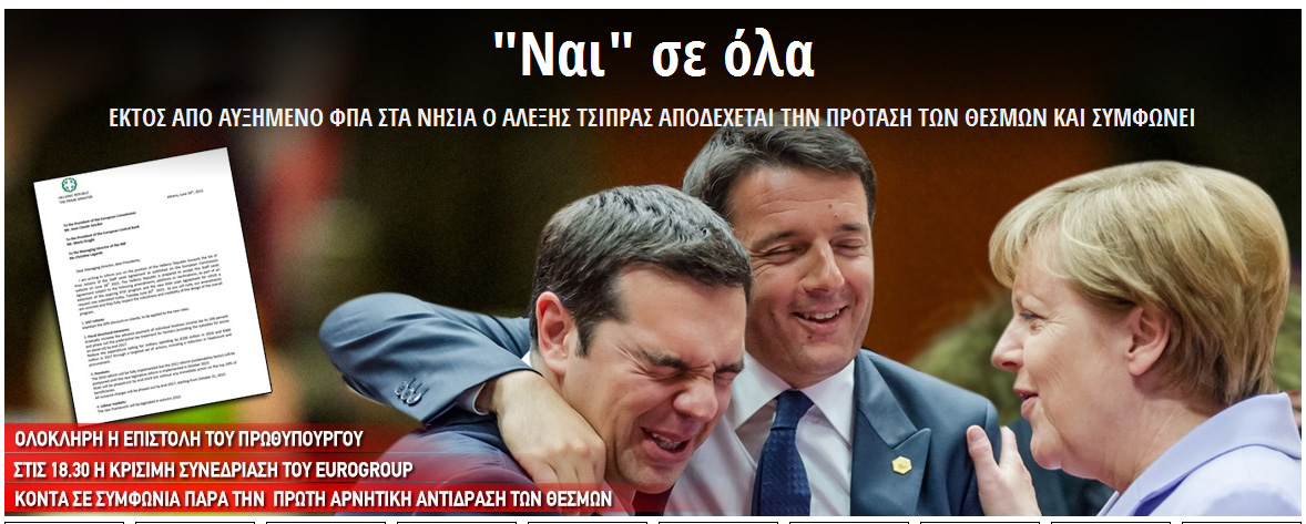 Ο Αλέξης Τσίπρας έστειλε το βράδυ της Τρίτης 2σέλιδο κείμενο προς τους επικεφαλής της Κομισιόν, του ΔΝΤ και της ΕΚΤ, με το οποίο αποδέχεται ουσιαστικά τις περισσότερες προτάσεις των θεσμών, όπως αυτές παρουσιάστηκαν από τον Ζαν-Κλοντ Γιούνκερ στις 28 Ιουνίου.