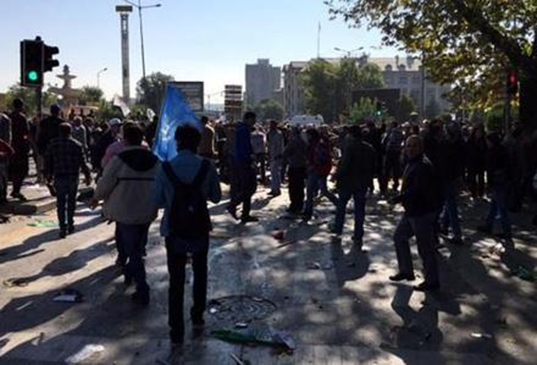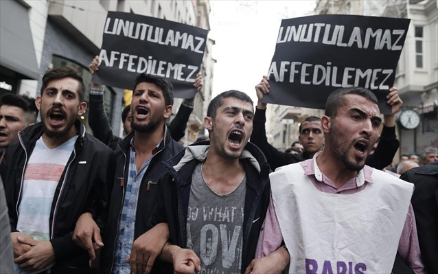 Διαδηλωτές κατηγόρησαν την κυβέρνηση για τις βομβιστικές επιθέσεις και ζήτησαν την παραίτηση του Τούρκου Προέδρου Ρετζέπ Ταγίπ ΕρντογάνΛίγες ώρες αργότερα, 10.000 διαδηλωτές οι οποίοι φώναζαν αντικυβερνητικά συνθήματα συγκεντρώθηκαν στην Κωνσταντινούπολη επιχειρώντας να πραγματοποιήσουν πορεία προς την κεντρική πλατεία Ταξίμ. Οι διαδηλωτές κατηγόρησαν την κυβέρνηση για τις βομβιστικές επιθέσεις που είχαν ως αποτέλεσμα τον θάνατο 86 ανθρώπων στην πρωτεύουσα Άγκυρα και ζήτησαν την παραίτηση του Τούρκου Προέδρου Ρετζέπ Ταγίπ Ερντογάν, επιρρίπτοντάς του ευθύνες για την πολύνεκρη επίθεση.