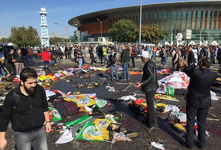 Oι εκρήξεις σημειώθηκαν έξω από τον μεγαλύτερο σιδηροδρομικό σταθμό της τουρκικής πρωτεύουσας, όπου πλήθος κόσμου (κυρίως Κούρδοι) είχε συγκεντρωθεί για να πραγματοποιήσει πορεία υπέρ της ειρήνης, μετέδωσε το πρακτορείο ειδήσεων Dogan.