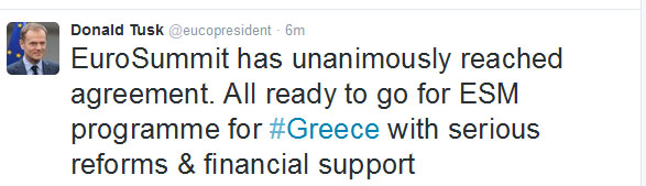 «Η Σύνοδος Κορυφής της Ευρωζώνης κατέληξε ομόφωνα σε συμφωνία. Όλα έτοιμα για να προχωρήσουμε σε ελληνικό πρόγραμμα από τον ESM με σοβαρές μεταρρυθμίσεις και οικονομική υποστήριξη» ανέφερε σε μήνυμά του στο Twitter ο Ντόναλντ Τουσκ.