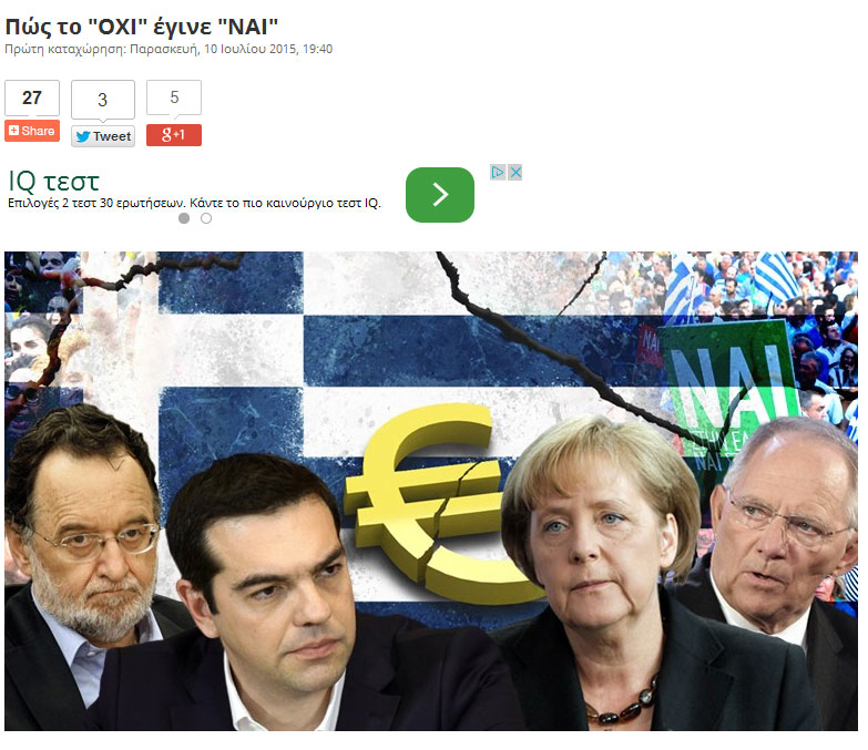 Ο λευκός καπνός και τα… συντρίμμια που αφήνουν πίσω τους οι χειραψίες του Έλληνα πρωθυπουργού με τους ηγέτες της Ευρώπης επιβεβαιώνουν πλήρως το ρεπορτάζ του zougla.gr για το πώς το ΟΧΙ του δημοψηφίσματος έγινε ΝΑΙ και τις επακόλουθες συνέπειες για τον ελληνικό λαό, ο οποίος καλείται πλέον να σηκώσει το βάρος σκληρών μέτρων δημοσιονομικής προσαρμογής. Το πρόγραμμα της Θεσσαλονίκης και οι προεκλογικές εξαγγελίες μπήκαν οριστικά στο χρονοντούλαπο της ιστορίας. Η ελληνική κυβέρνηση βρίσκεται πλέον αντιμέτωπη με τη σκληρή πραγματικότητα, καλούμενη να πράξει με τη «λογική των αριθμών».