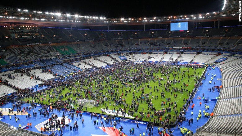 Ήταν στις 10:17 το βράδυ όταν ακούστηκε έκρηξη κοντά στο κατάμεστο από 80.000 κόσμου Stade de France, όπου βρισκόταν σε εξέλιξη η φιλική αναμέτρηση των εθνικών ομάδων Γαλλίας και Γερμανίας, με τον Φρανσουά Ολάντ να βρίσκεται στις εξέδρες.