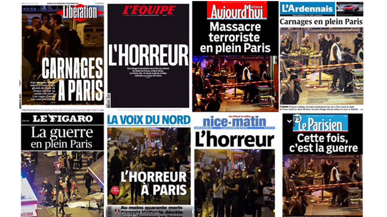 Το μαύρο χρώμα κυριαρχεί στα πρωτοσέλιδα του γαλλικού Τύπου, ενώ δεσπόζουν οι λέξεις «τρόμος», «πόλεμος» και «σφαγή».