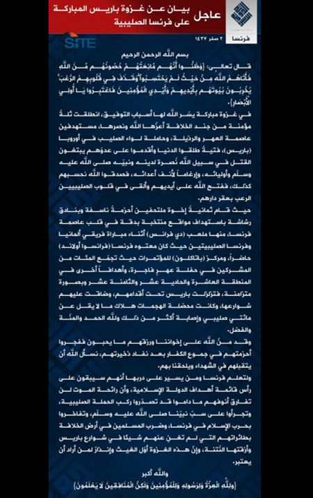 Προσθέτει πως οι επιθέσεις ήταν επίσης μια απάντηση στις ύβρεις σε βάρος του προφήτη του Ισλάμ και στις αεροπορικές επιδρομές σε εδάφη που ελέγχει το Χαλιφάτο.