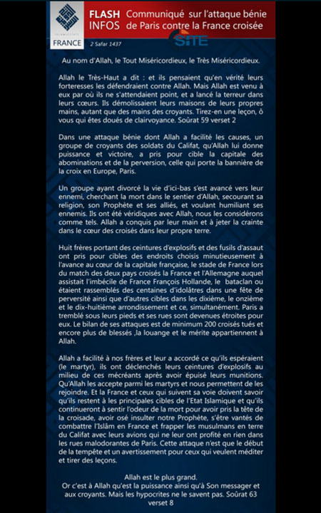 «Οκτώ αδελφοί, που έφεραν ζώνες με εκρηκτικά και ήταν οπλισμένοι με τουφέκια, έβαλαν στόχο τοποθεσίες που είχαν επιλεγεί επιμελώς στην καρδιά του Παρισιού» αναφέρεται στην ανακοίνωση.