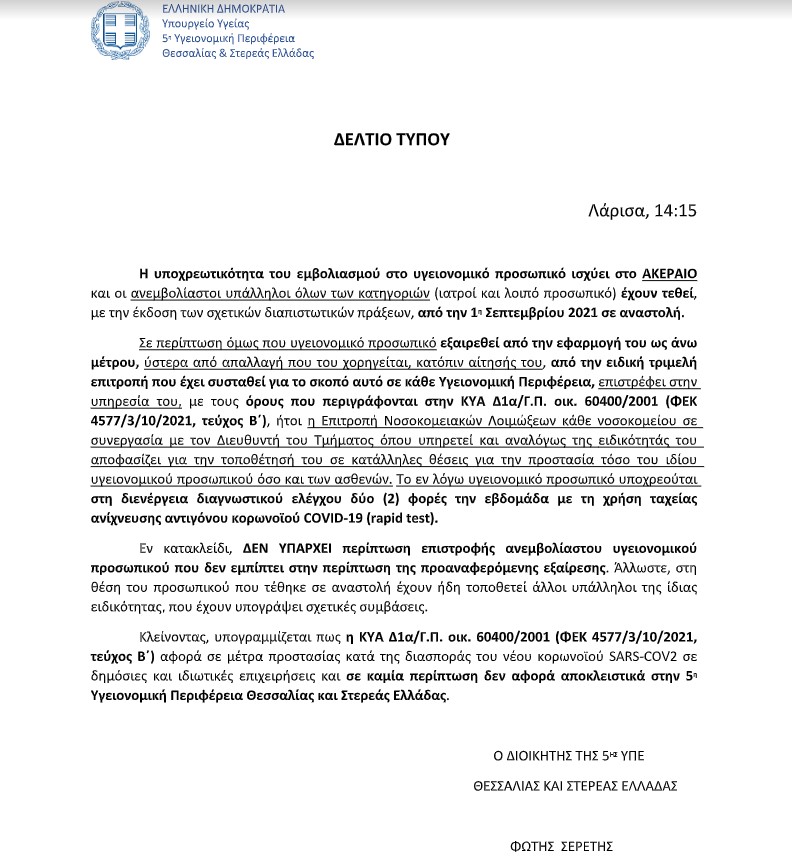 Σε απάντηση στο δημοσίευμα της «Ζούγκλας» σχετικά με τη σταδιακή επιστροφή ανεμβολίαστων υγειονομικών σε νοσοκομεία, η 5η Υγειονομική Περιφέρεια επισημαίνει σε δελτίο Τύπου που εξέδωσε: