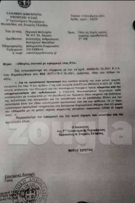 Σύμφωνα με εγκύκλιο του υπουργείου Υγείας που απευθύνεται στην 5η Υγειονομική Περιφέρεια (δηλαδή σε Θεσσαλία – Στερεά Ελλάδα), επιστρέφουν σταδιακά στις δομές υγείας της περιοχής οι ανεμβολίαστοι υγειονομικοί, ιατροί και νοσηλευτές.
