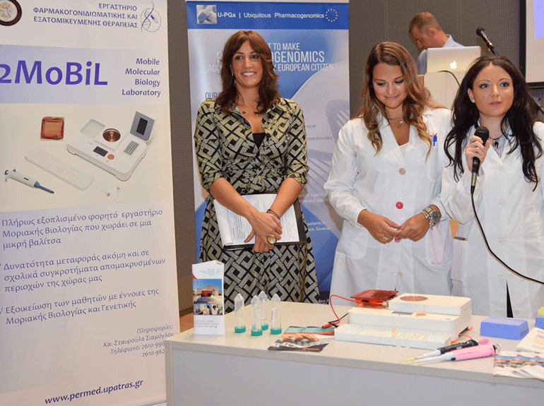 Ο λόγος για το «Φορητό εργαστήριο Μοριακής Βιολογίας 2MoBiL» μέσω του οποίου το πρωί στην Αγορά Αργύρη έγινε μια πρώτη προσέγγιση σε πάνω από 260 μαθητές από 7 δημοτικά, γυμνάσια και λύκεια της Πάτρας από μέλη του εργαστηρίου Φαρμακογονιδιωματικής και Εξατομικευμένης Θεραπείας:από τη κυρία Σταυρούλα Σιαμόγλου, φαρμακοποιό και υποψήφια διδάκτωρ και την ομάδα της που αποτελούνταν από τις κυρίες Ζωή Κορδού, Αθηνά Τσικρικά, Ασημίνα Ανδρίτσου, Δέσποινα Σισμανόγλου και Γεωργία Παπαδοπούλου με σκοπό την εξοικείωση των μαθητών και των καθηγητών τους με το αντικείμενο της γενετικής και Εξατομικευμένης Ιατρικής και τον καθηγητή Πανεπιστημίου Πατρών κο Γεώργιο Πατρινό στο τιμόνι της ενημέρωσης.