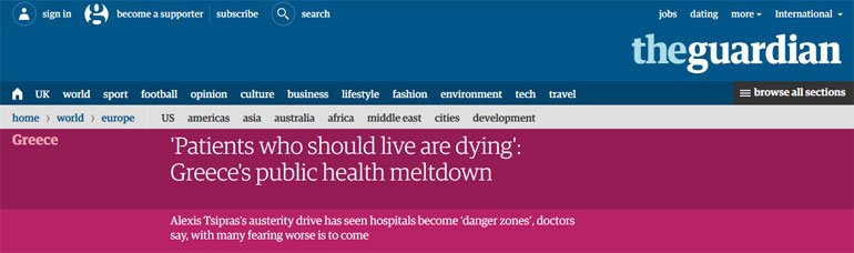 Για κατάρρευση της δημόσιας υγείας στην Ελλάδα κάνει λόγο σε άρθρο της η βρετανική εφημερίδα «Guardian», υπογραμμίζοντας χαρακτηριστικά ότι «πεθαίνουν ακόμα και ασθενείς που θα έπρεπε να ζουν», καθώς και ότι λόγω της λιτότητας τα νοσοκομεία έχουν μετατραπεί σε επικίνδυνες ζώνες.