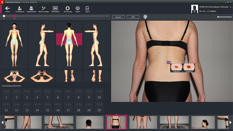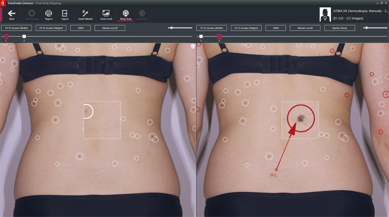 Αμέσως, στην οθόνη του μηχανήματος εμφανίζονται υψηλής ανάλυσης ολόσωμες εικόνες και επισημαίνονται αυτόματα οι αλλαγές που εντοπίζονται σε σχέση με τις εικόνες της προηγούμενης εξέτασης. Κάθε μεταβαλλόμενος ή νεοεμφανιζόμενος σπίλος υποδεικνύεται άμεσα από το σύστημα, παρακινώντας έτσι τον ιατρό να εστιάσει την προσοχή του εκεί.
