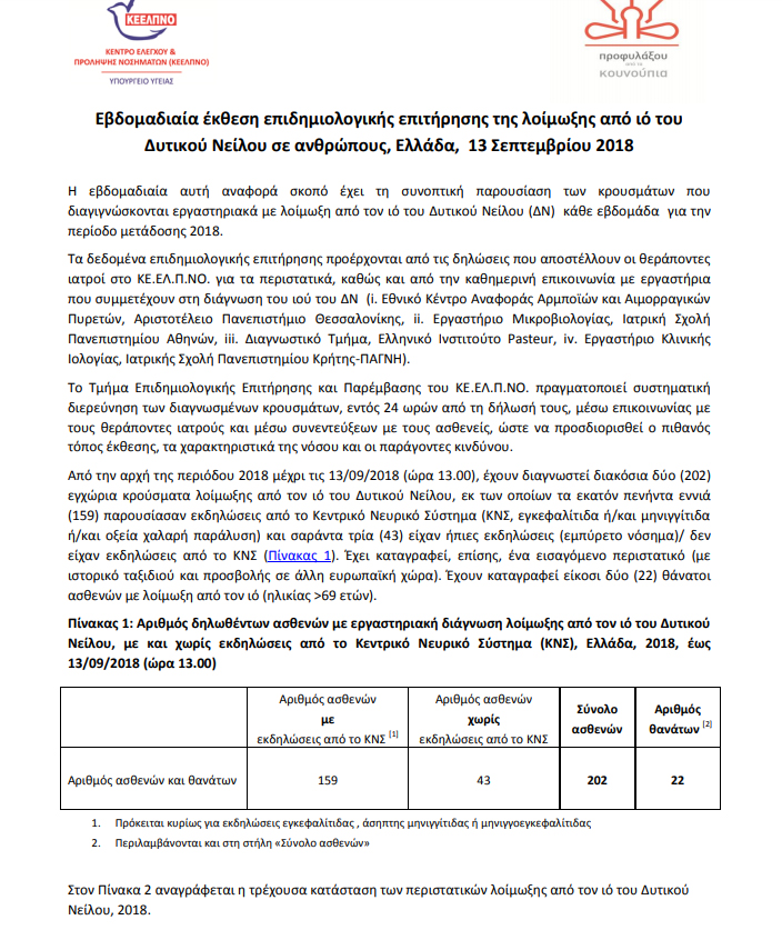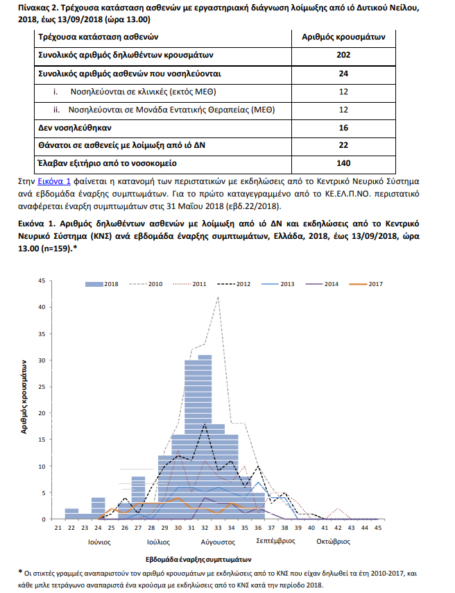 Παράλληλα, εξιτήριο έχουν λάβει μέχρι σήμερα 140 άτομα που προσβλήθηκαν από τον ιό του Δυτικού Νείλου, που μεταδίδεται με το τσίμπημα των κουνουπιών.