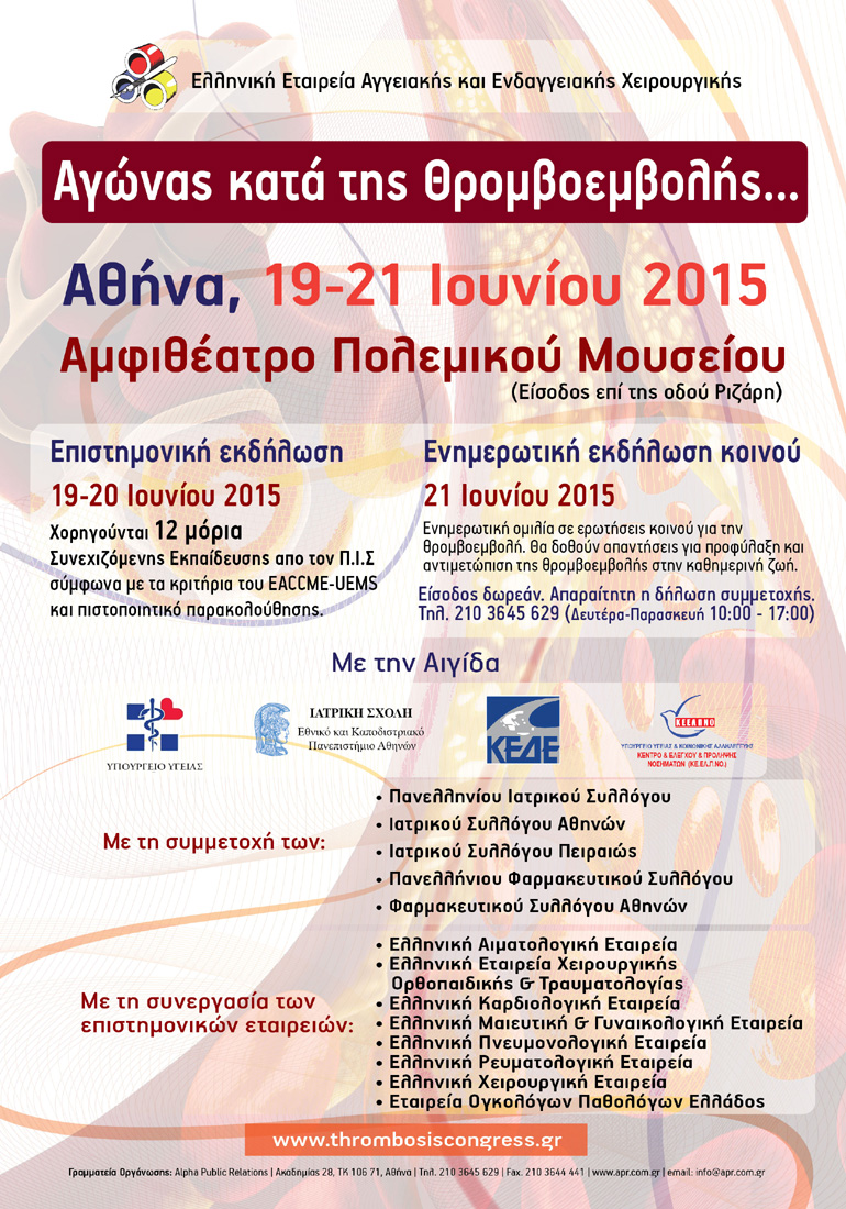 Η είσοδος είναι ελεύθερη. Για περισσότερες πληροφορίες μπορεί το κοινό να τηλεφωνεί στο 210 36 45 629 ή στο site www.thrombosiscongress.gr