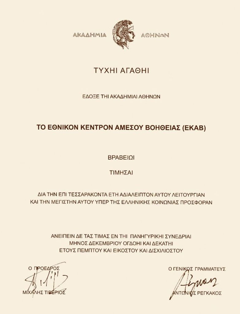 Η Ακαδημία Αθηνών απένειμε τιμητική διάκριση στο ΕΚΑΒ, με αφορμή τη συμπλήρωση 40 ετών συνεχούς λειτουργίας και προσφοράς στην προστασία της ανθρώπινης ζωής και στη διασφάλιση της δημόσιας υγείας. Πρόκειται για μια ύψιστη τιμητική αναγνώριση από το ανώτατο πνευματικό ίδρυμα της χώρας, με ιδιαίτερο συμβολισμό για έναν δημόσιο φορέα, που υπηρετεί τον πολίτη στο πιο κρίσιμο πεδίο της ανθρώπινης ανάγκης.