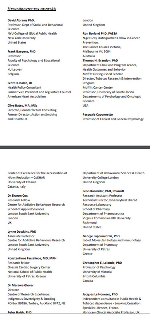 Ο ειδικός επί του ζητήματος, με δεκάδες δημοσιεύσεις σε διεθνή επιστημονικά περιοδικά σχετικά με τις επιπτώσεις του ατμίσματος στη δημόσια υγεία, Δρ. Κωνσταντίνος Φαρσαλινός, Επιστημονικός συνεργάτης στο Ωνάσειο, συγκέντρωσε δεκάδες υπογραφές από συναδέλφους του ιατρούς και επιστήμονες-ειδικούς στο κάπνισμα, από πανεπιστήμια και ερευνητικά ινστιτούτα από όλο τον κόσμο.