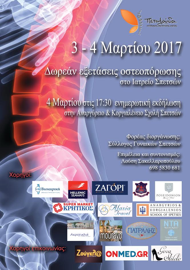 Ο Σύλλογος Σκελετικής Υγείας «Πεταλούδα»*, που είναι επίσημα αναγνωρισμένος από το Διεθνές Ίδρυμα Οστεοπόρωσης (ΙΟF) και την Παγκόσμια Οργάνωση Υγείας (WHO) διοργανώνει με τον Σύλλογο Γυναικών Σπετσών και συντονίστρια τη Λούση Σακελλαροπούλου, εκδήλωση προληπτικού ελέγχου και ενημέρωσης για την οστεοπόρωση, το διήμερο 3 – 4 Μαρτίου 2017.