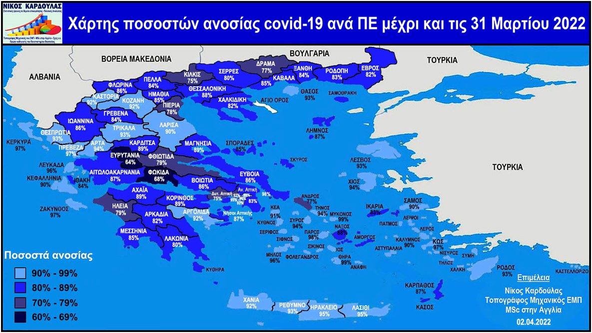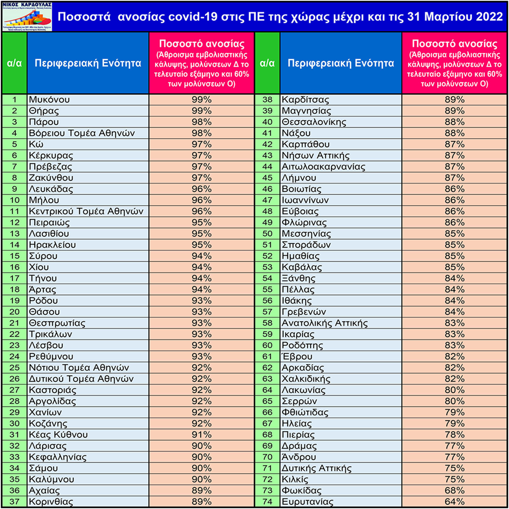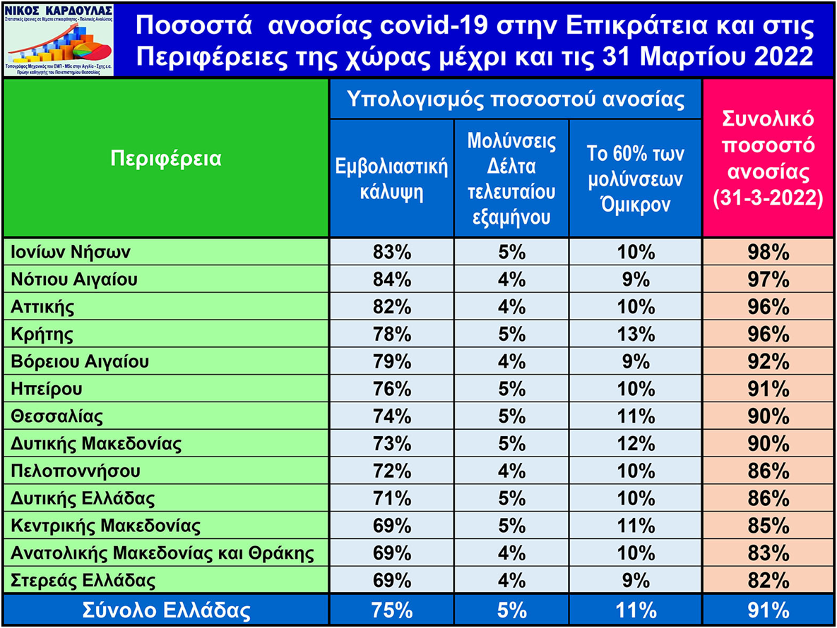 Στον παρακάτω πίνακα απεικονίζονται τα ποσοστά ανοσίας μέχρι και τις 31 Μαρτίου 2022, τόσο στην Επικράτεια, όσο και στις 13 Περιφέρειες της χώρας, από τον οποίο συμπεραίνεται: