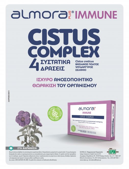 Ένα νέο καινοτόμο σκεύασμα για την ενίσχυση της φυσιολογικής λειτουργίας του ανοσοποιητικού συστήματος κυκλοφόρησε πρόσφατα η ΕLPEN, εμπλουτίζοντας την ήδη επιτυχημένη σειρά προϊόντων almora PLUS®. Το almora PLUS® CISTUS COMPLEX είναι ένα σύγχρονο συμπλήρωμα διατροφής με καινοτόμο και μοναδική σύνθεση 4 συστατικών φυσικής προέλευσης, τα οποία εμφανίζουν αντιϊκή και αντιβακτηριακή δράση, καθώς και ευεργετικά οφέλη για τη θωράκιση του οργανισμού.