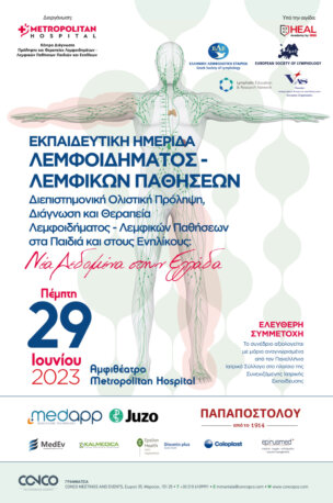 Το Κέντρο Διάγνωσης, Πρόληψης και Θεραπείας Λεμφοιδήματος – Οιδημάτων και Λεμφικών Παθήσεων Παιδιών και Ενηλίκων του Metropolitan Hospital, σε συνεργασία με την Ελληνική Λεμφολογική Εταιρεία υπό την αιγίδα της Heal Academy/HHG, της Ευρωπαϊκής Λεμφολογικής Εταιρείας της VAS – European Independent Foundation in Angiology/ Vascular Medicine και της Lymphatic Education and Research Network διοργανώνει την 1η Λεμφολογική Ημερίδα «Διεπιστημονική Ολιστική Πρόληψη, Διάγνωση και Θεραπεία Λεμφοιδήματος – Λεμφικών Παθήσεων στα παιδιά και στους ενηλίκους» στο αμφιθέατρο του Metropolitan Hospital στις 29 Ιουνίου 2023.