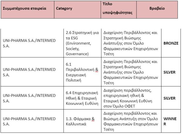 Τέσσερα σημαντικά βραβεία που αφορούν στην Στρατηγική για τα ESG (Environment, Society, Governance), στην Περιβαλλοντική & Ενεργειακή Πολιτική και στην Επιχειρησιακή Ηθική & Εταιρική Κοινωνική Ευθύνη, κατέκτησαν οι UNI-PHARMA και InterMed στο πλαίσιο των βραβείων Manufacturing Excellence Αwards 2022, που οργάνωσε ο όμιλος Μπούσσια, την 1η Νοεμβρίου 2022.