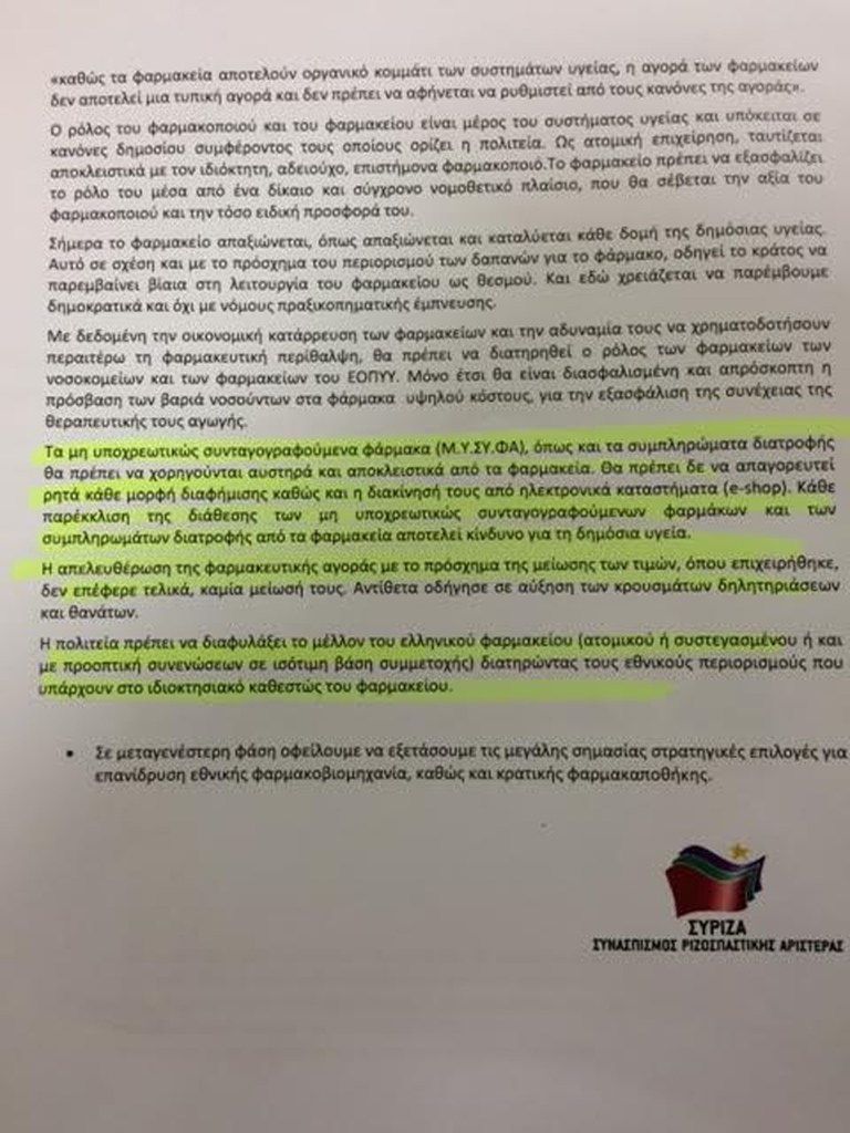 «Για μία ακόμη φορά, οι μεθοδευμένες αντικοινωνικές παρεμβάσεις της μνημονιακής συγκυβέρνησης καθ΄ υπόδειξη της τρόικας στον τομέα της υγείας, έχουν σκοπό να επιβαρύνουν περισσότερο τους πολίτες και να πλήξουν το ελληνικό φαρμακείο της γειτονιάς υπέρ των μεγάλων συμφερόντων» αναφερόταν σε ανακοίνωση που είχε εκδώσει εκείνη την περίοδο το Τμήμα Υγείας του ΣΥΡΙΖΑ λόγω απεργιακής κινητοποίησης των φαρμακοποιών.