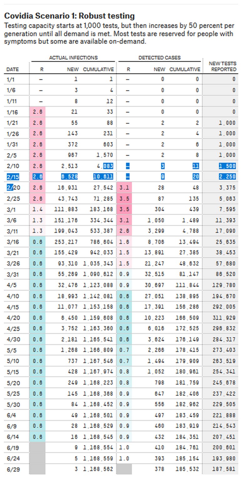 Το R δεν αναγράφεται αν δεν υπάρχουν τουλάχιστον 10 νέες περιπτώσεις στην αρχή μιας γενιάς. Άλλες υποθέσεις κοινές σε όλα τα σενάρια: Ο πληθυσμός της χώρας είναι 10 εκατομμύρια. Τα άτομα δοκιμάζονται μόνο μία φορά. Μερικά άτομα με ήπια συμπτώματα και τα περισσότερα με ασυμπτωματικά συμπτώματα δεν θέλουν να είναι και δεν εξετάζονται. Οι δοκιμές έχουν ψευδώς αρνητικό ποσοστό 20% και ψευδώς θετικό ποσοστό 0,2%. Η δοκιμαστική αναφορά καθυστερεί τη μόλυνση κατά 15 ημέρες.