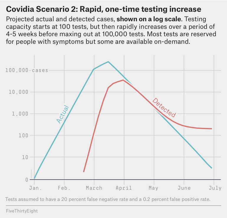 Ποια θα ήταν η πιο ταχεία αύξηση των τεστ; Στο Σενάριο 2, αφήνω όλες τις παραμέτρους από το Σενάριο 1 αμετάβλητες – εκτός από τον αριθμό των τεστ. Σε αυτό το νέο σενάριο, υποθέτω ότι η Covidia ξεκινάει με την ικανότητα να διεξάγει μόνο 100 δοκιμές ανά γενιά, αλλά στη συνέχεια προχωρεί σε πρόγραμμα εντατικοποίησης τον Φεβρουάριο και αυξάνει ταχύτατα αυτόν τον αριθμό με ρυθμό 200 τοις εκατό ανά γενιά μέχρι να ξεπεράσει τις 100.000 δοκιμές περίπου έναν μήνα αργότερα. Αυτό είναι παρόμοιο με την κατάσταση στις Ηνωμένες Πολιτείες , όπου οι δοκιμές ξεκίνησαν αργά, βελτιώθηκαν γρήγορα και έχουν πλέον σταματήσει ξανά.