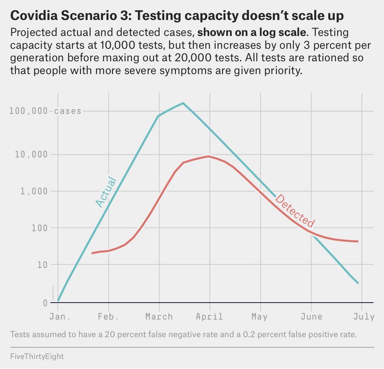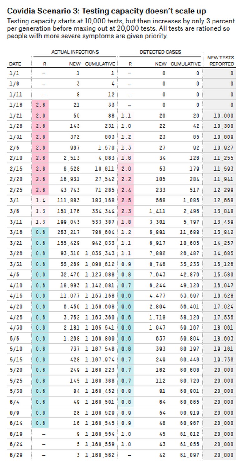 Έτσι δεν υποτιμάται μόνο ο αριθμός των κρουσμάτων- αλλά κι ο ρυθμός αύξησης θα υποτιμηθεί επίσης. Για παράδειγμα, σε αυτό το σενάριο, το R φαίνεται να κορυφώνει στα χαμηλά έως τα μέσα του 2 όταν είναι στην πραγματικότητα 2.6. Αυτό οφείλεται στο γεγονός ότι ο αριθμός των νέων περιπτώσεων αυξάνεται ταχύτερα από ό,τι η ικανότητα της χώρας να τα ανιχνεύει, ακόμη και αν η χώρα έχει τόσα πολλά τεστ, ώστε να μπορεί να τα εφαρμόσει στα ασθενέστερα άτομα, όπως υποθέτουμε ότι συμβαίνει. Κατά τη διάρκεια της αιχμής της επιδημίας στο Σενάριο 3, το 58% των πρόσφατα αναφερόμενων τεστ θα έχει θετικά αποτελέσματα, κάτι που μοιάζει με τον εξαιρετικά υψηλό ρυθμό των αναφερθέντων θετικών τεστ για περιόδους χρόνου σε περιοχές όπως η Λομβαρδία της Ιταλίας.