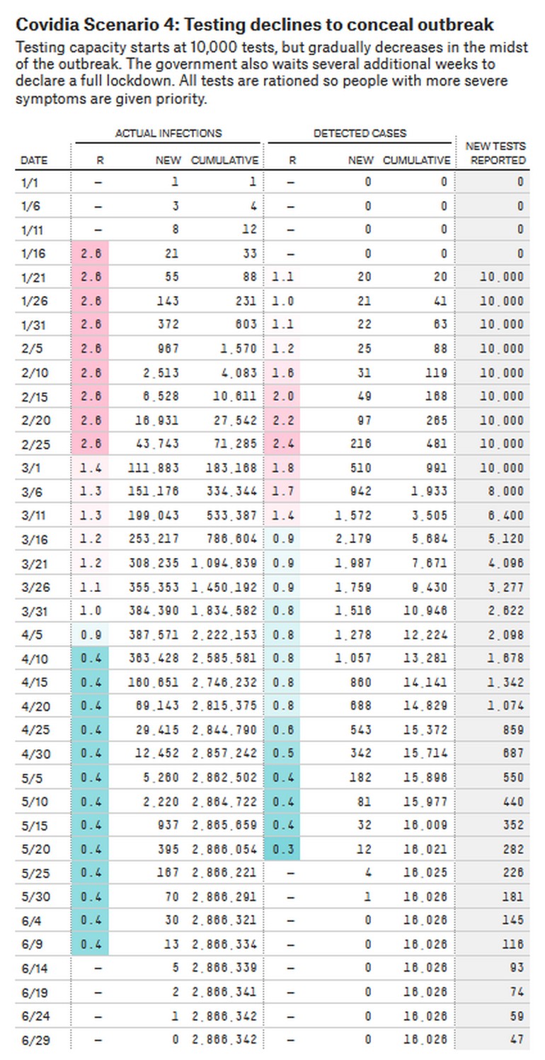 Ας υποθέσουμε ότι, όπως στο Σενάριο 3, η Covidia ξεκινάει με την ικανότητα να διεξάγει 10.000 δοκιμές ανά γενιά. Ωστόσο, καθώς η καταμέτρηση των περιπτώσεων αρχίζει να επιταχύνεται, η κυβέρνηση παραπονιέται ότι το «ξέσπασμα» θα της κάνει κακό, και έτσι ξεκινάει με υποβαθμισμένη την ικανότητα δοκιμής κατά 20% ανά γενιά, στις αρχές Μαρτίου. Εν τω μεταξύ, επειδή αρνούμαστε την κλίμακα του προβλήματος, δεν εφαρμόζει πλήρες lock down μέχρι τις 10 Απριλίου ή περισσότερο από τρεις εβδομάδες αργότερα από ό, τι στα άλλα σενάρια.